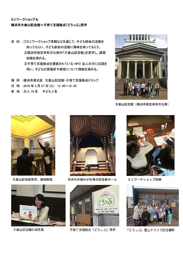 横浜市大倉山記念館で建物見学を行い、子ども部会の活動を知ってもらうための「ミニワークショップ」を体験、その後、横浜市港北区子育て支援拠点「どろっぷ」を見学し、子どもの居場所についての理解を深めました。